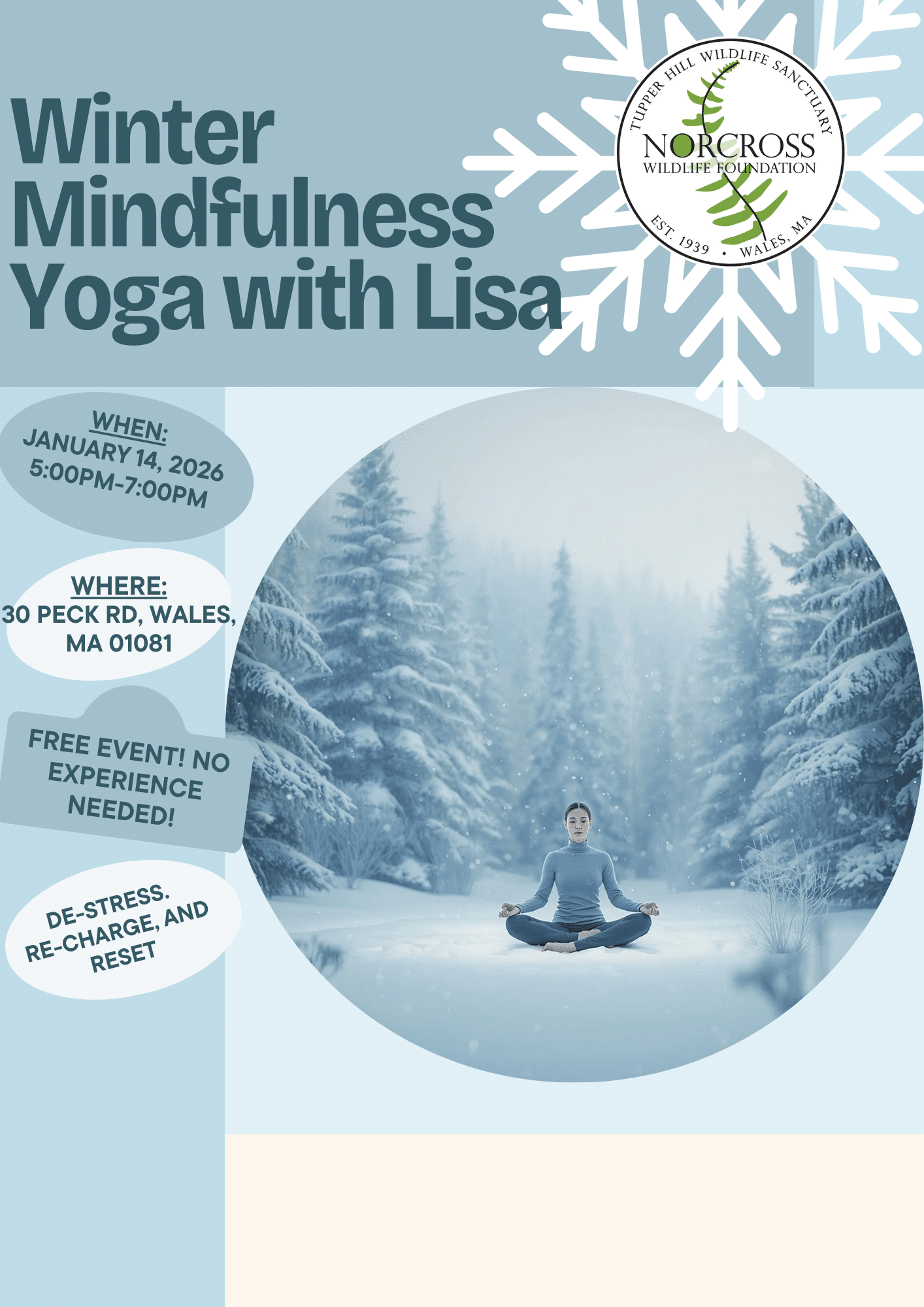 Norcross Wildlife Foundation 30 Peck Road, Wales, MAEvent Description: Hike & Mindfulness Yoga SessionJoin us for a rejuvenating combination of nature and mindfulness! This event is designed to help you de-stress, recharge, and reset. We'll start with …